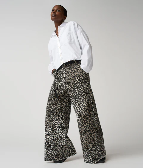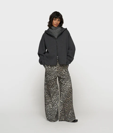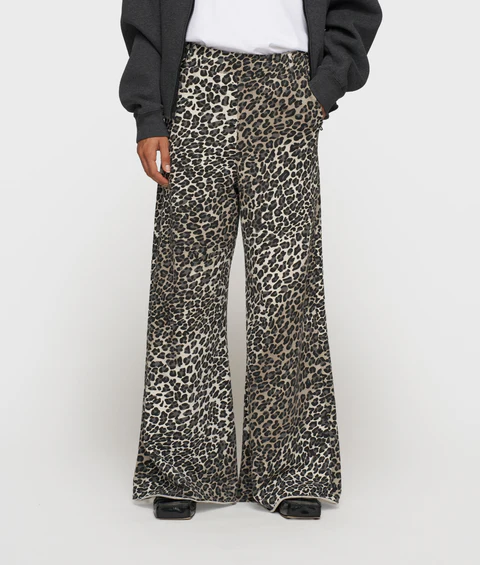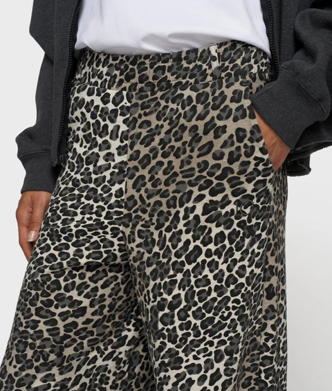 Jogger ancho de leopardo, de corte regular, confeccionado en suave algodón orgánico con certificación GOTS. Presenta cinturilla elástica con trabillas, bolsillos laterales inclinados y monograma «10» bordado debajo del bolsillo izquierdo.