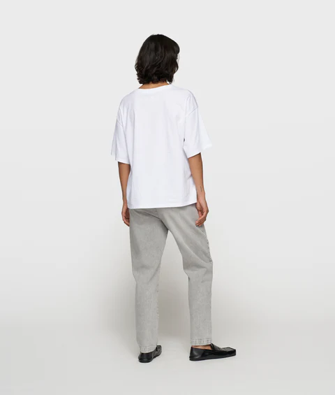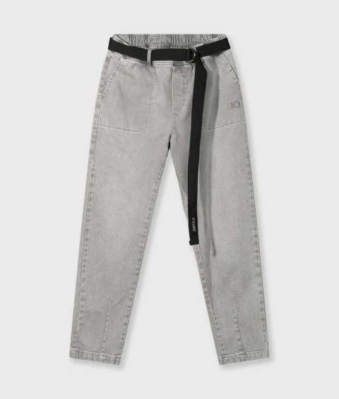 Pantalones de corte regular con cinturón, confeccionados en suave algodón orgánico con certificación GOTS. Presentan cinturilla elástica con trabillas y cinturón ajustable con hebilla, bolsillos laterales inclinados, un falso bolsillo trasero, el logo «10DAYS» en el cinturón y un «10» bordado debajo del bolsillo izquierdo.