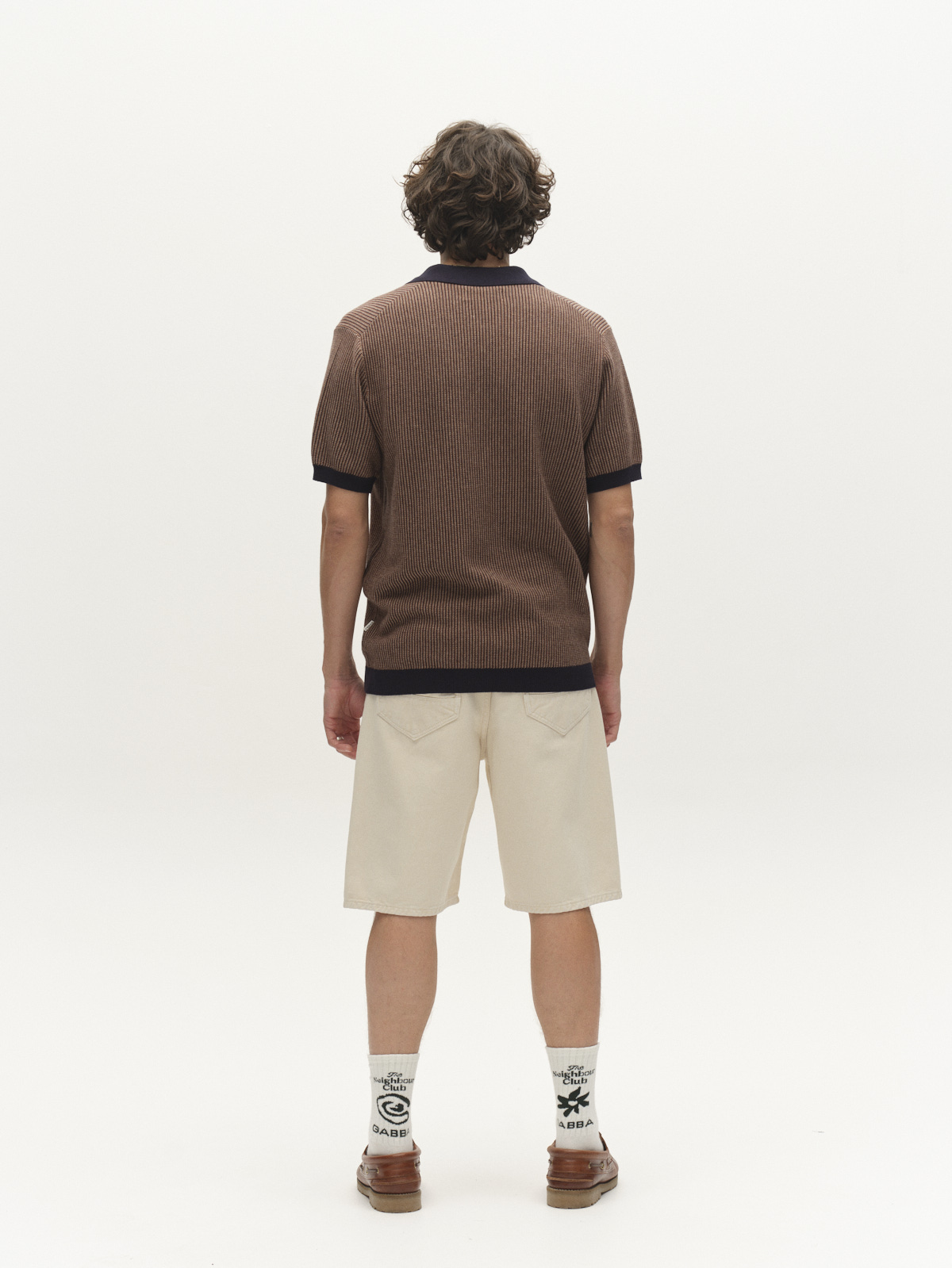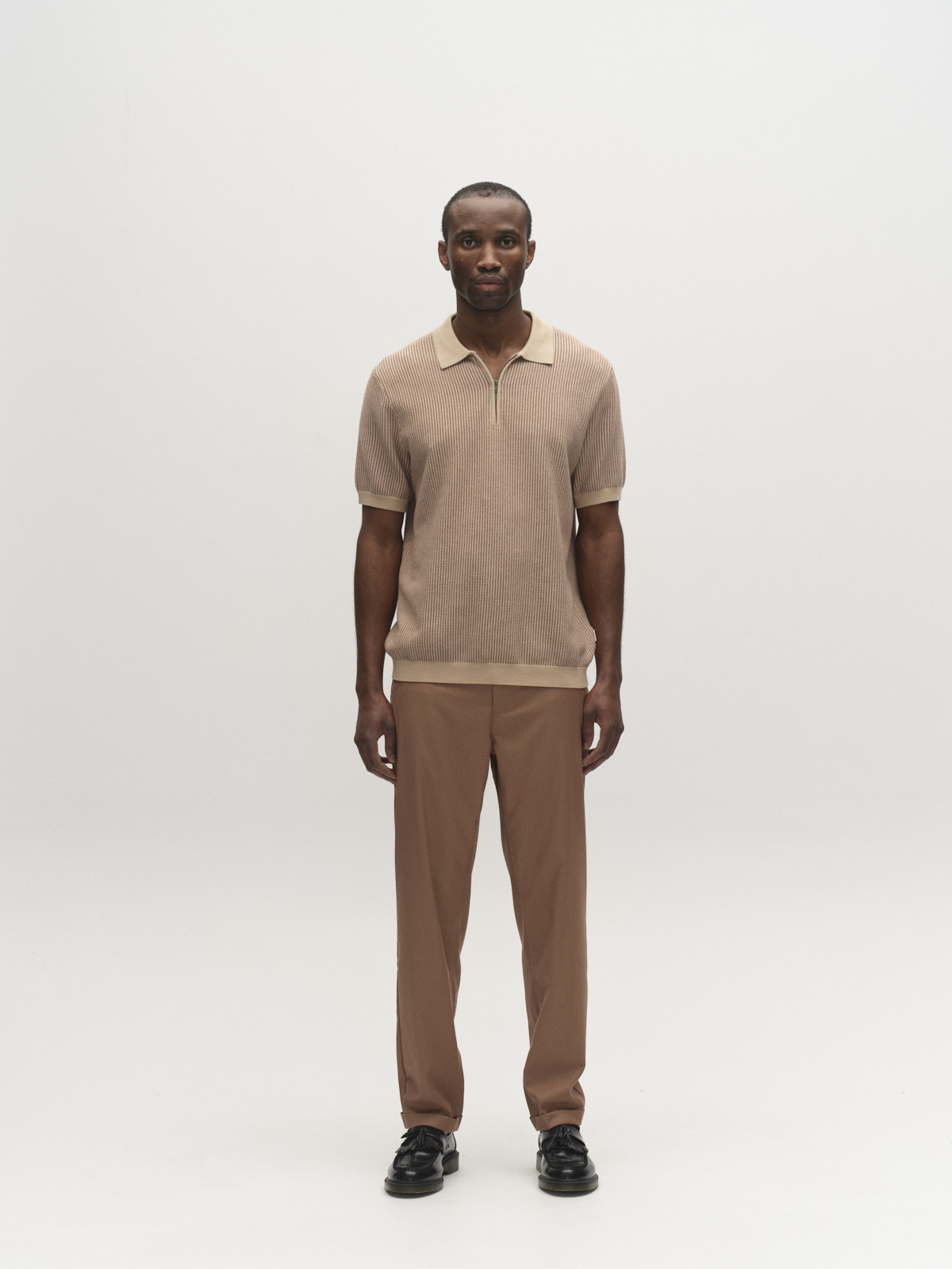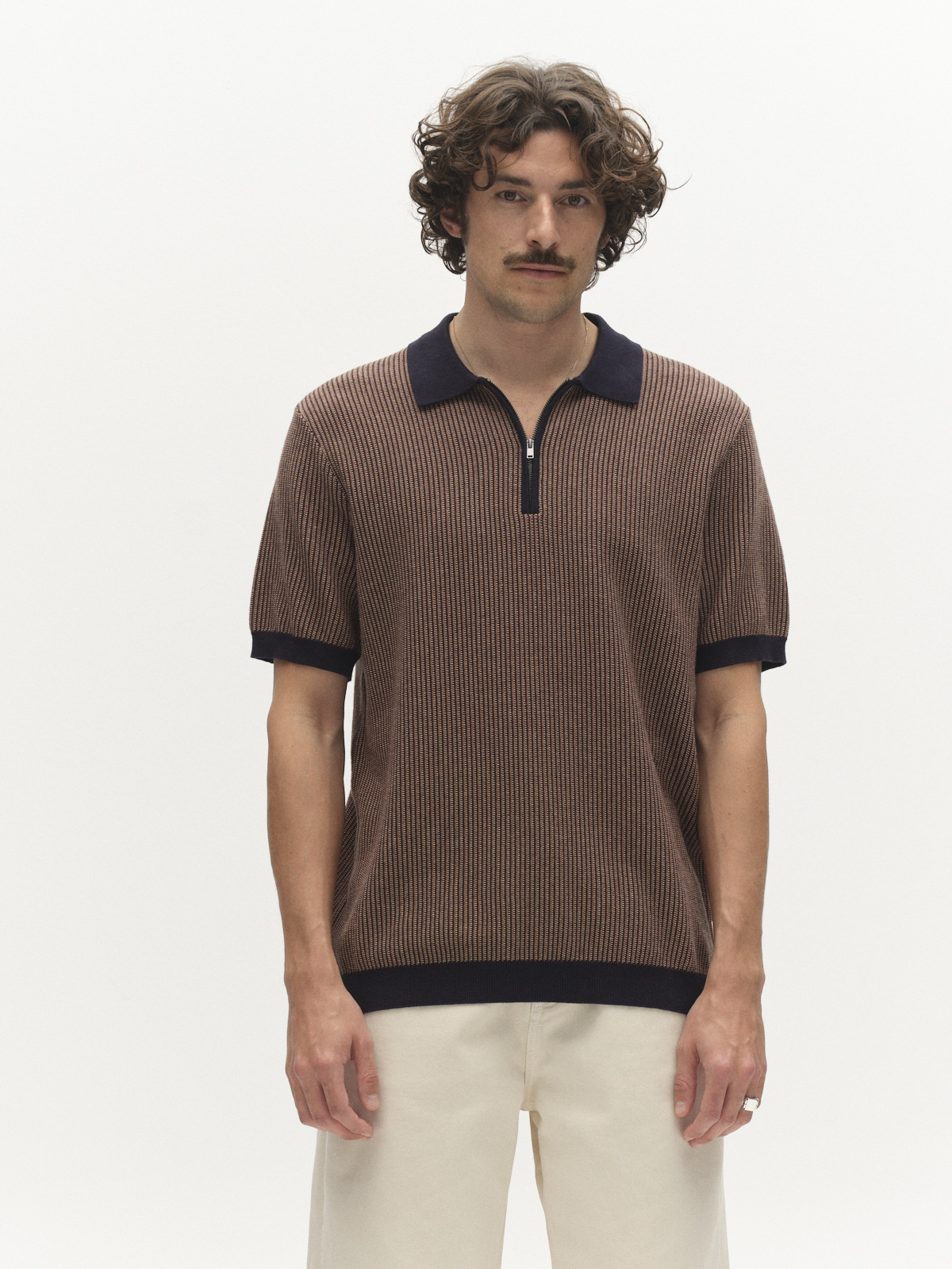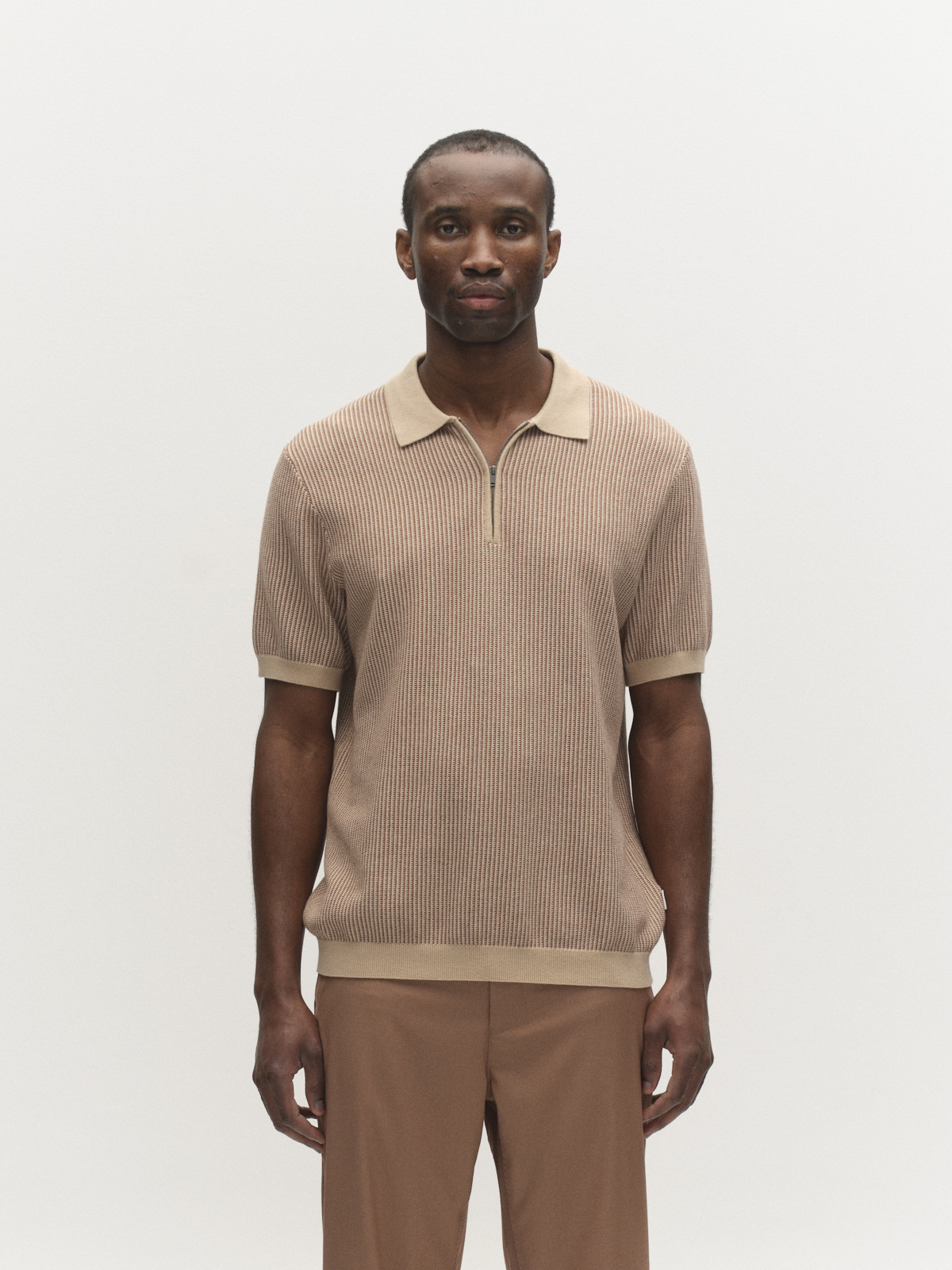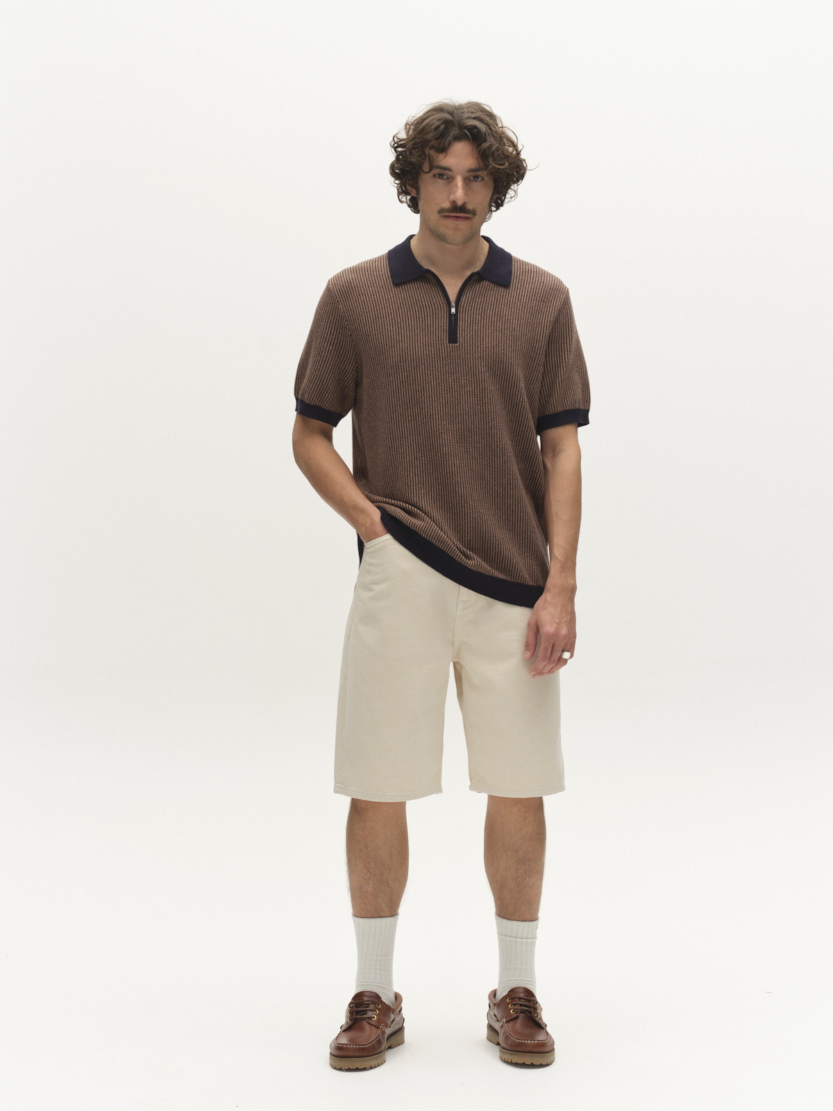 Un polo de punto de manga corta inspirado en el retro, confeccionado con hilo de algodón con estructura de nervadura 3D, que añade profundidad y textura a la superficie. El Gaboswald Retro SS Knit presenta un clásico cuello tipo polo con apertura con cremallera, que combina referencias vintage con un aspecto limpio y contemporáneo. Los extremos de las mangas acanalados y el bajo de las mangas completan el diseño, creando una silueta refinada pero relajada, adecuada para el uso diario.
