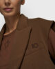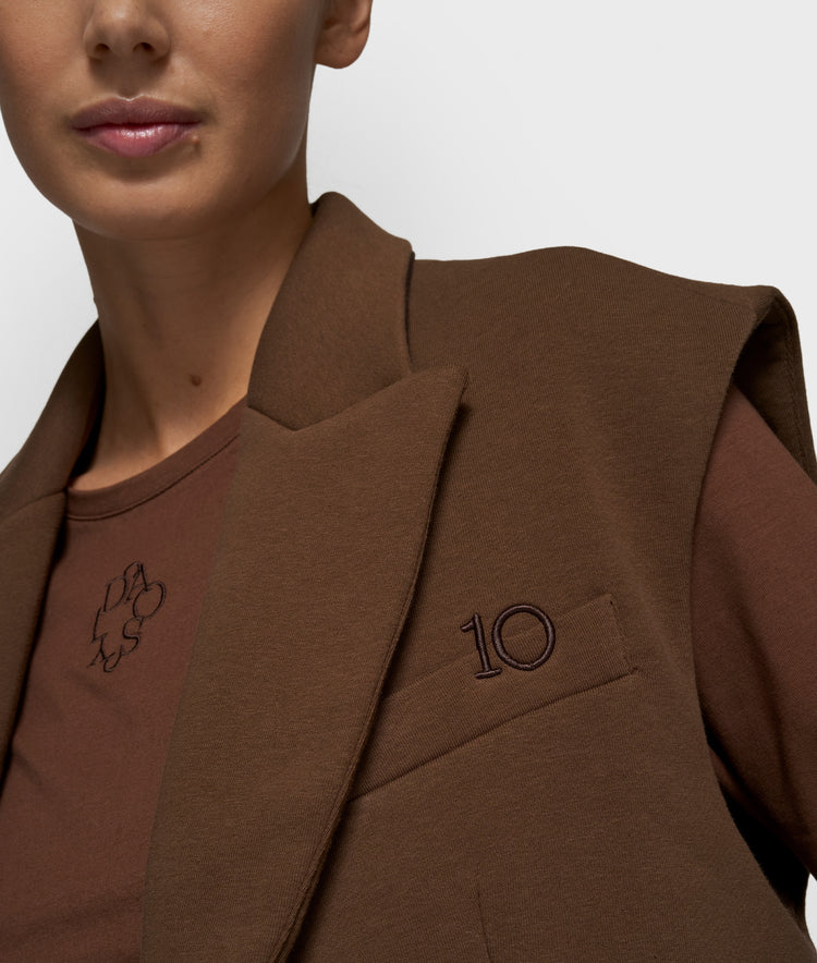 Blazer sin mangas de corte holgado, fabricado con una suave mezcla de algodón y poliéster. Cuenta con cuello, un bolsillo de pecho falso con bordado en relieve del monograma ’10’ y una hebilla ajustable en la parte trasera. 90% algodón, 8% poliéster, 2% elastano