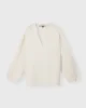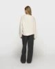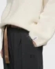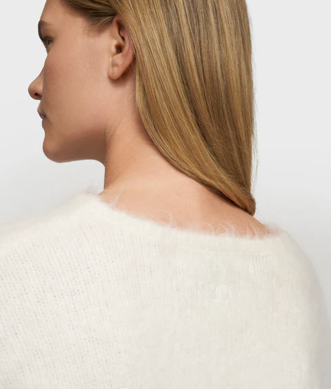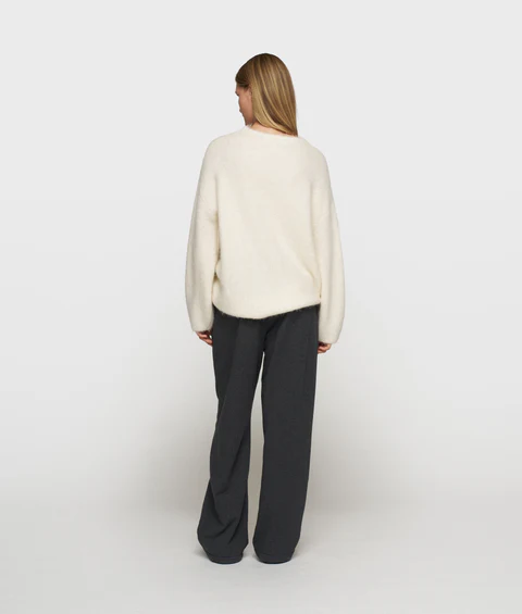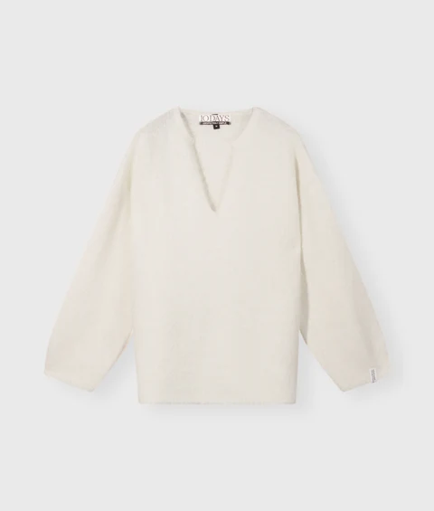 Suéter de punto oversize con cuello en V, confeccionado en una suave mezcla de lana de alpaca. Presenta ribetes finos de canalé, un monograma «10» bordado en la parte superior de la espalda y una etiqueta con el eslogan en la parte inferior de la manga izquierda.
