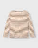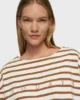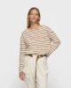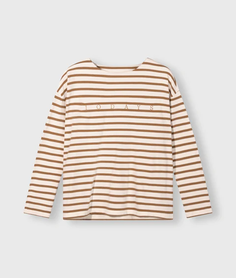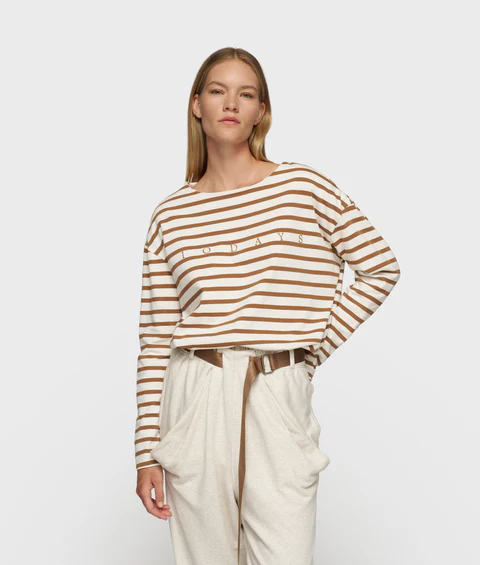 Top de rayas de talla grande, hecho de suave algodón orgánico certificado por GOTS. Presenta un amplio escote barco, pequeñas aberturas laterales, hombros caídos, un estampado de caja ’10DAYS’ en el pecho y un bordado con el monograma ’10’ en la manga izquierda.