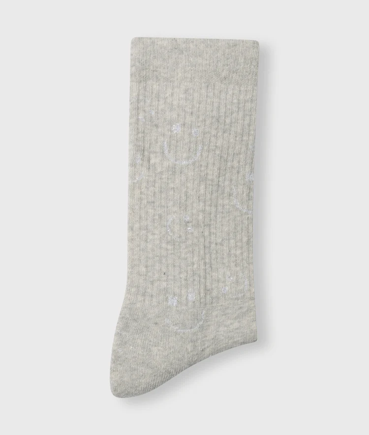 Calcetines acanalados con un estampado de caritas sonrientes por todo el pie y el logo en la planta. Diseñados con puño acanalado y detalles en lúrex plateado brillante…