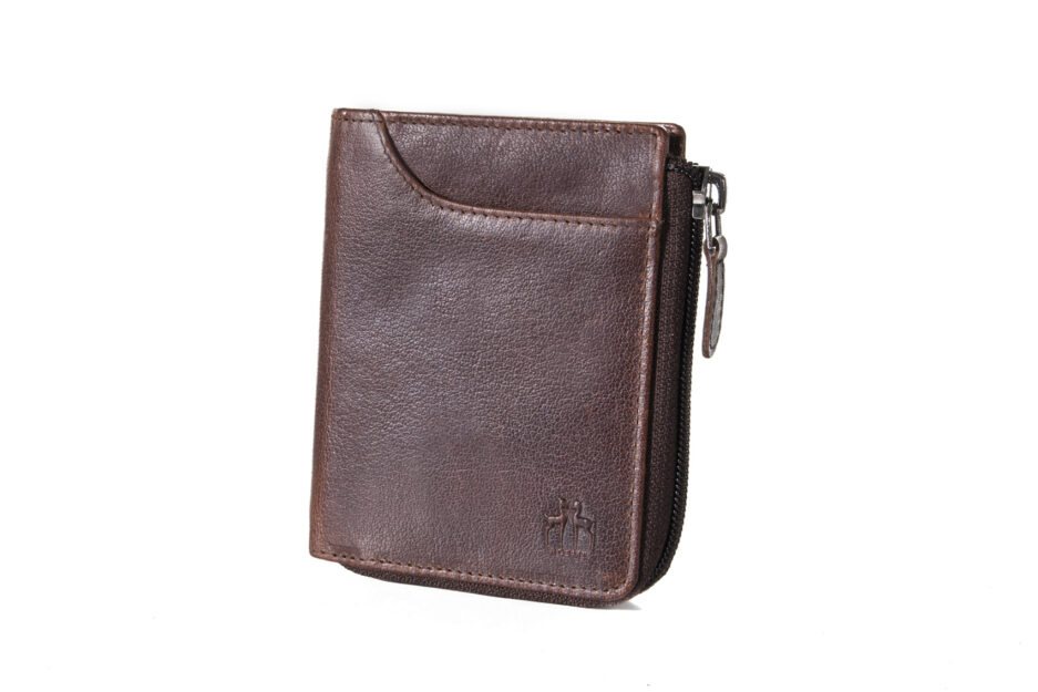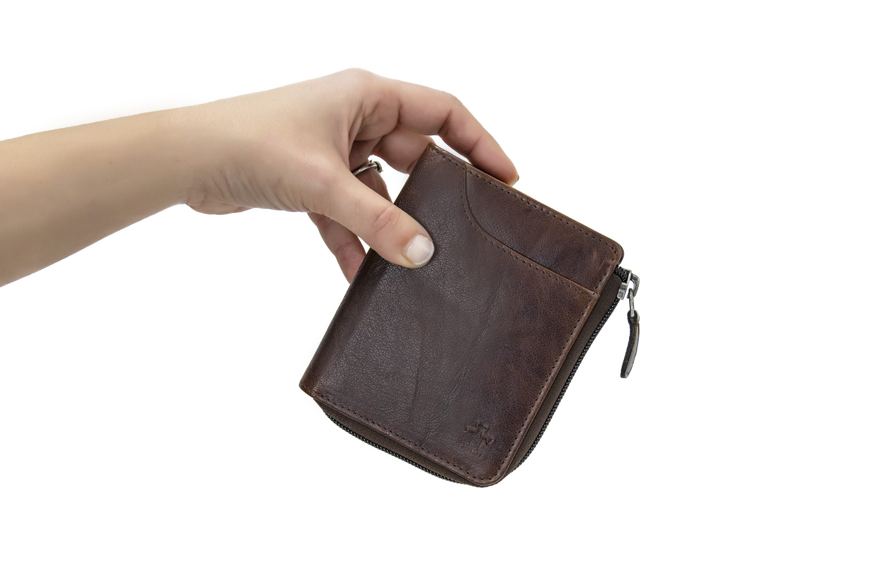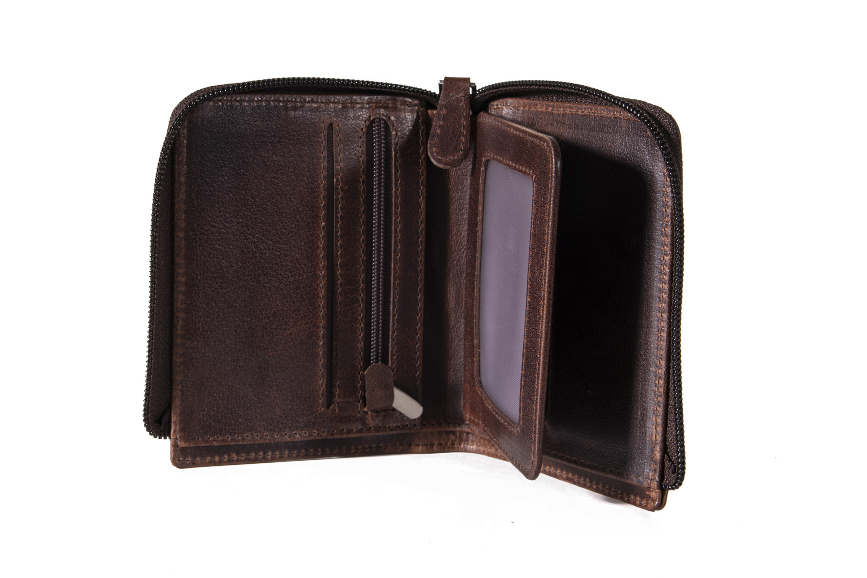 Cartera de piel de gran capacidad, cerrada con cremallera. En su interior dispone de ocho departamentos para tarjetas, un amplio billetero y apartado especial cerrado con cremallera para guardar monedas.