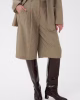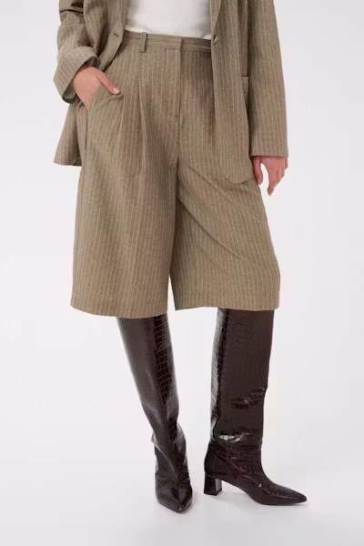 Los pantalones cortos bermuda de rayas finas presentan una silueta entallada de pierna ancha con pliegues frontales y pasadores de cinturón. Aspecto estructurado hasta la rodilla con un acabado nítido y suave para un toque