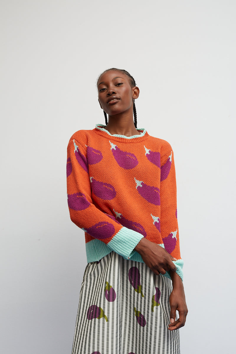 Con fondo color teja y un estampado de berenjenas en tono vino, esta prenda aporta un toque fresco y desenfadado a cualquier look. Los remates en verde agua en el cuello, los puños y el bajo, iluminan el diseño y le dan un contraste vibrante muy Bloom.