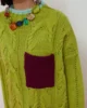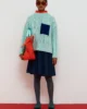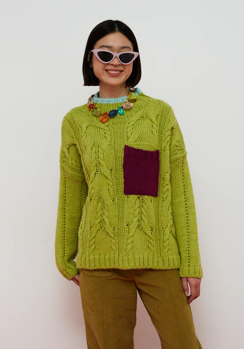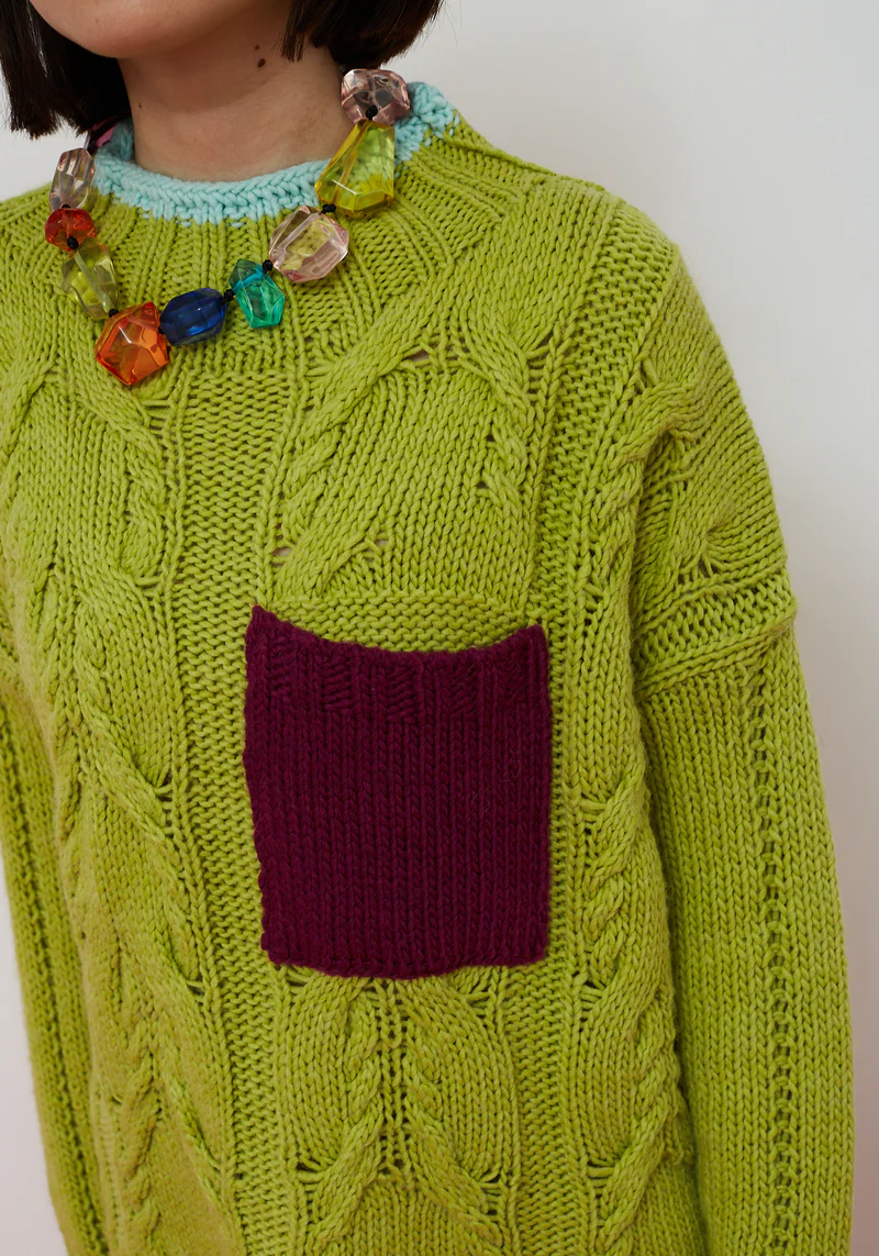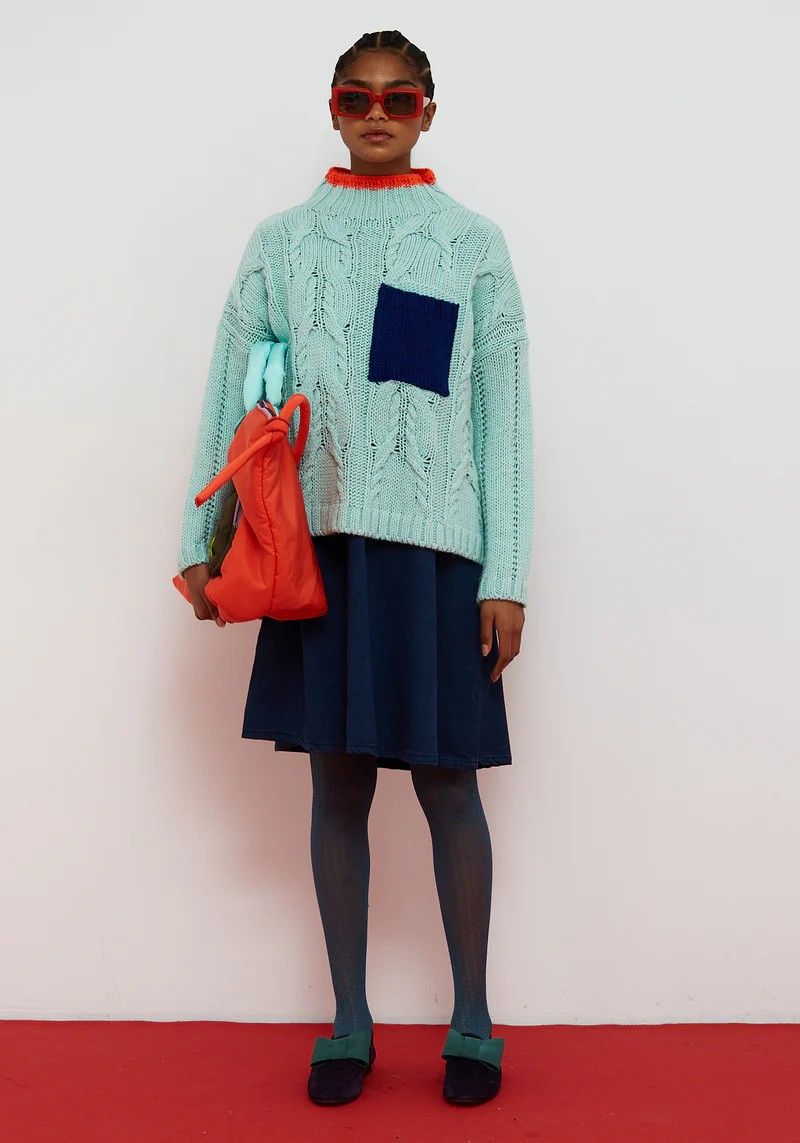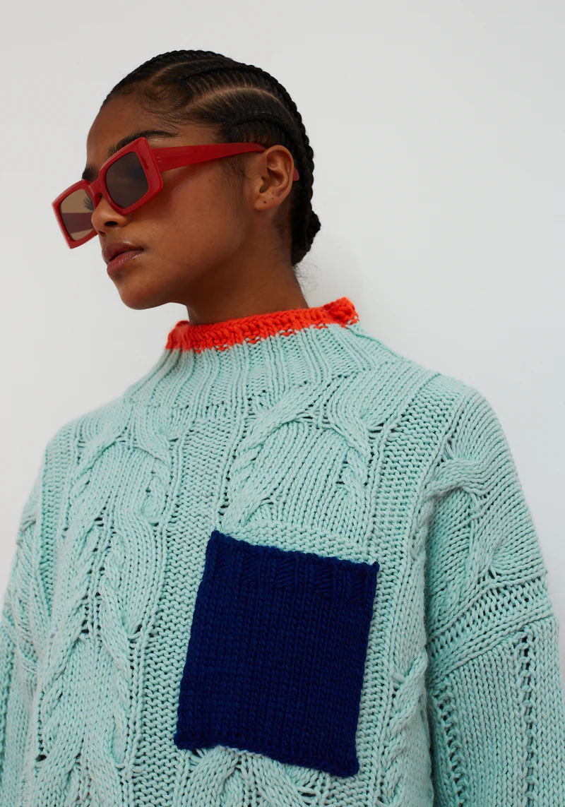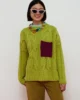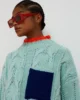 Jersey de punto trenzado color pistacho y azul agua. Cuello redondo de embudo. Corte recto, acabado en canalé en puños y bajo. Bolsillo en el pecho.