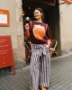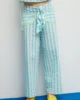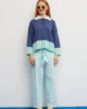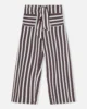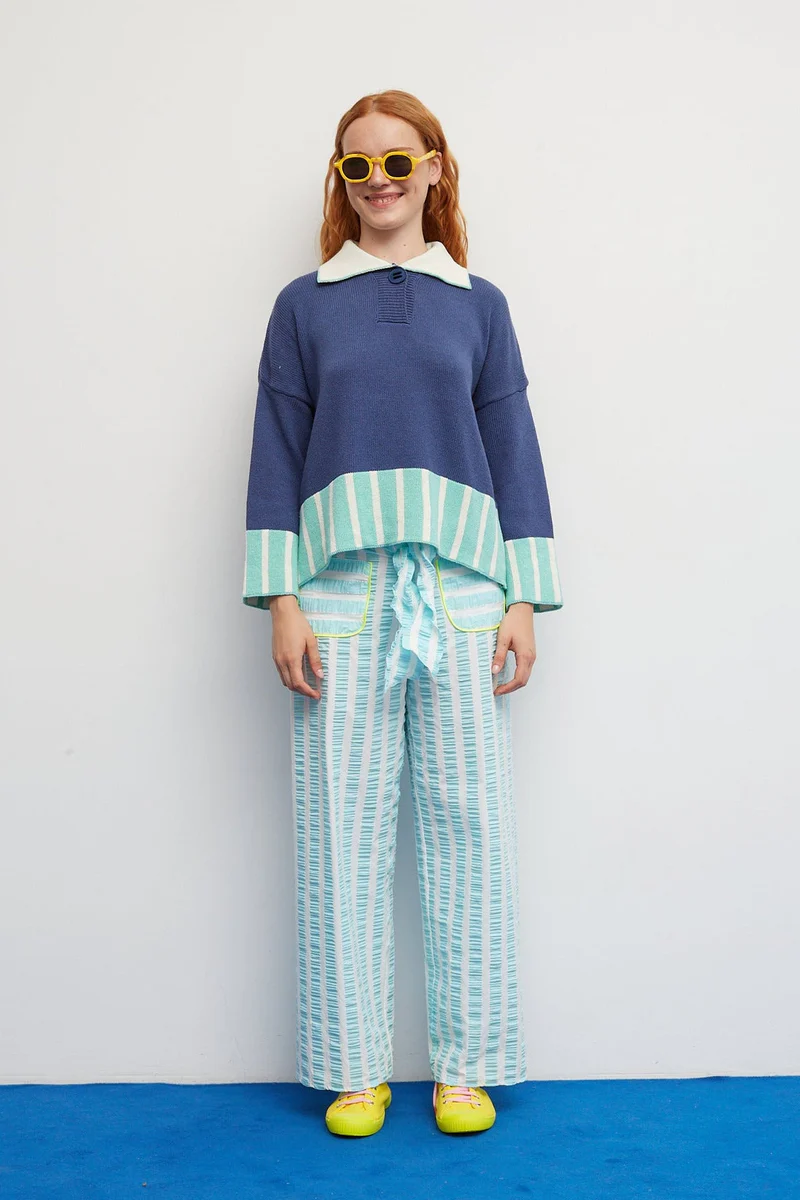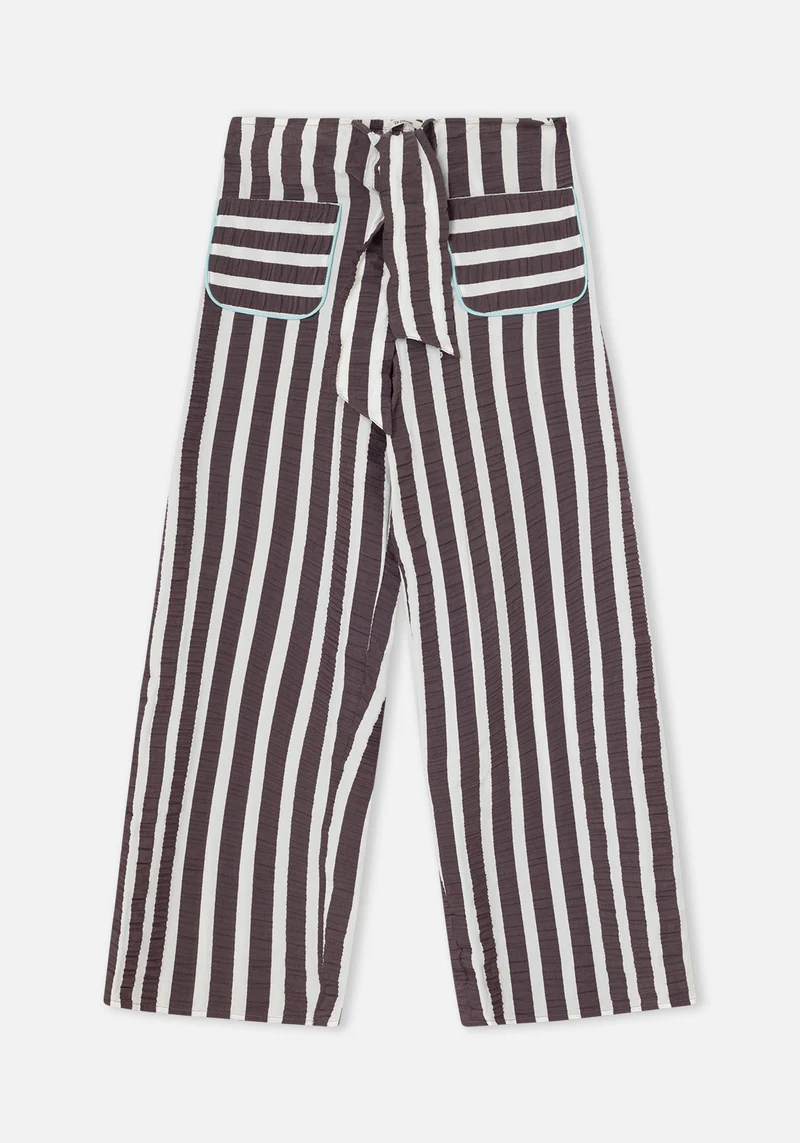 Un pantalón versátil, luminoso y con detalles que marcan la diferencia. Su diseño en rayas verticales en color berenjena o azul agua y blanco crea un efecto fresco y estilizado, mientras que el lazo frontal añade un toque único. Los bolsillos con ribete en agua aportan un contraste sutil y divertido. Con un corte recto y fluido, es una prenda cómoda y fácil de llevar, ideal para los días cálidos. El tejido ligero aporta movimiento y mantiene la sensación de frescura durante todo el día.
