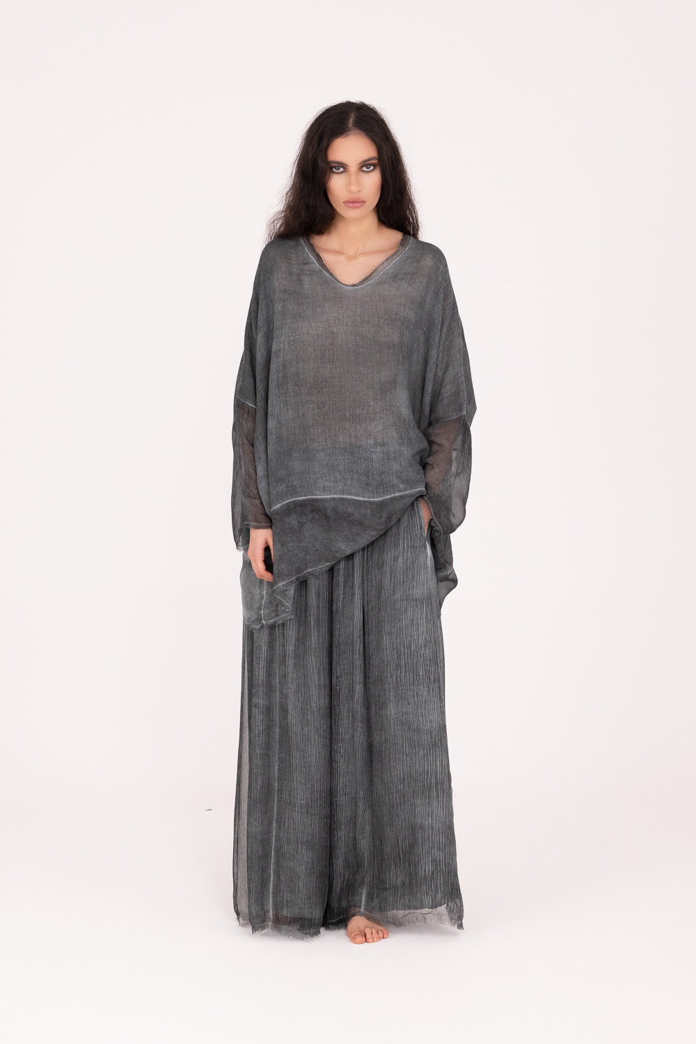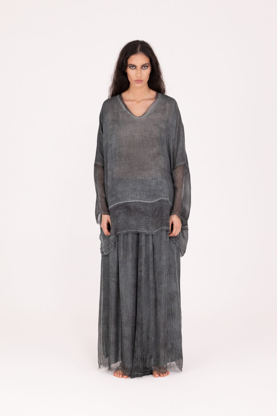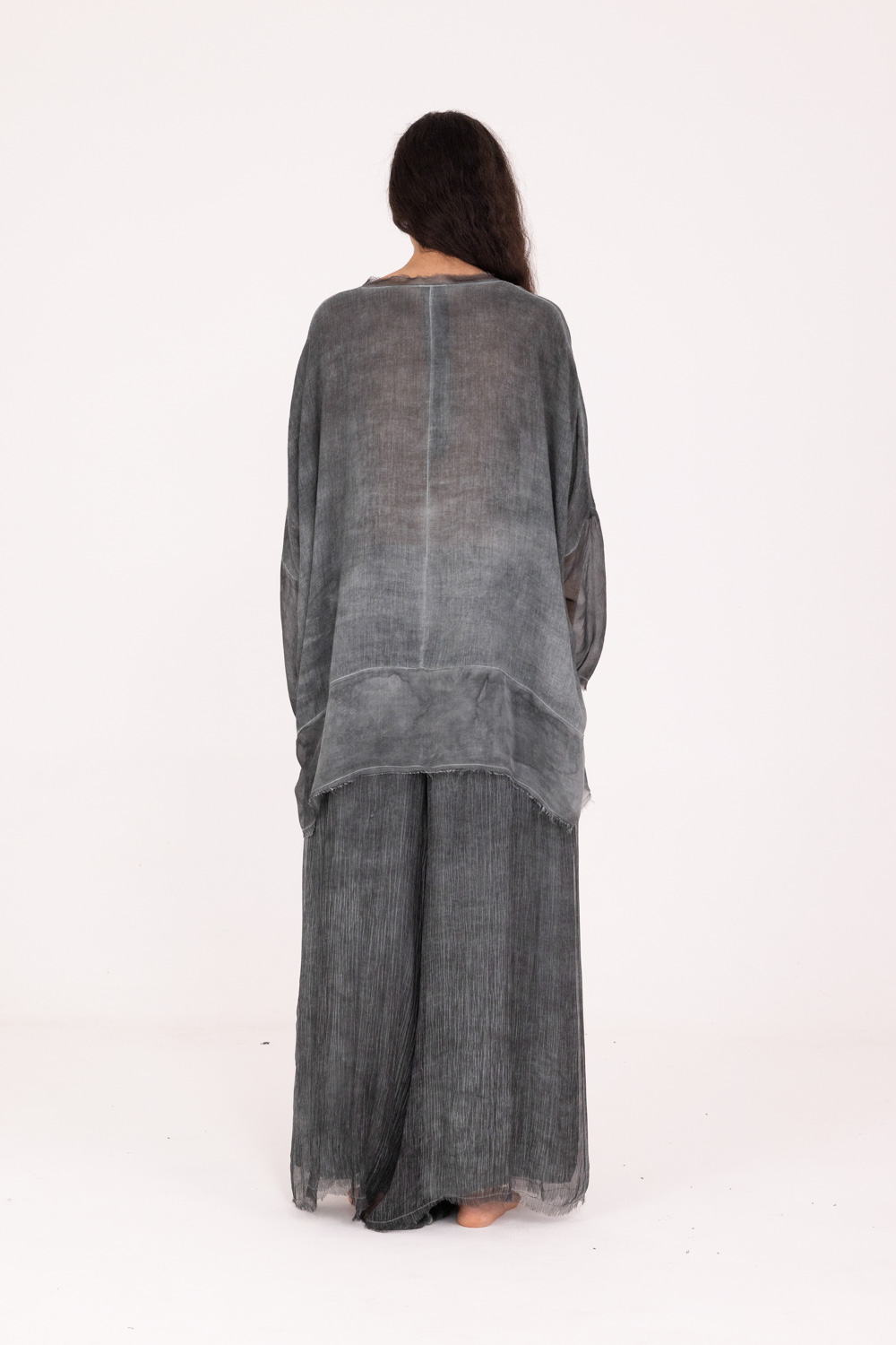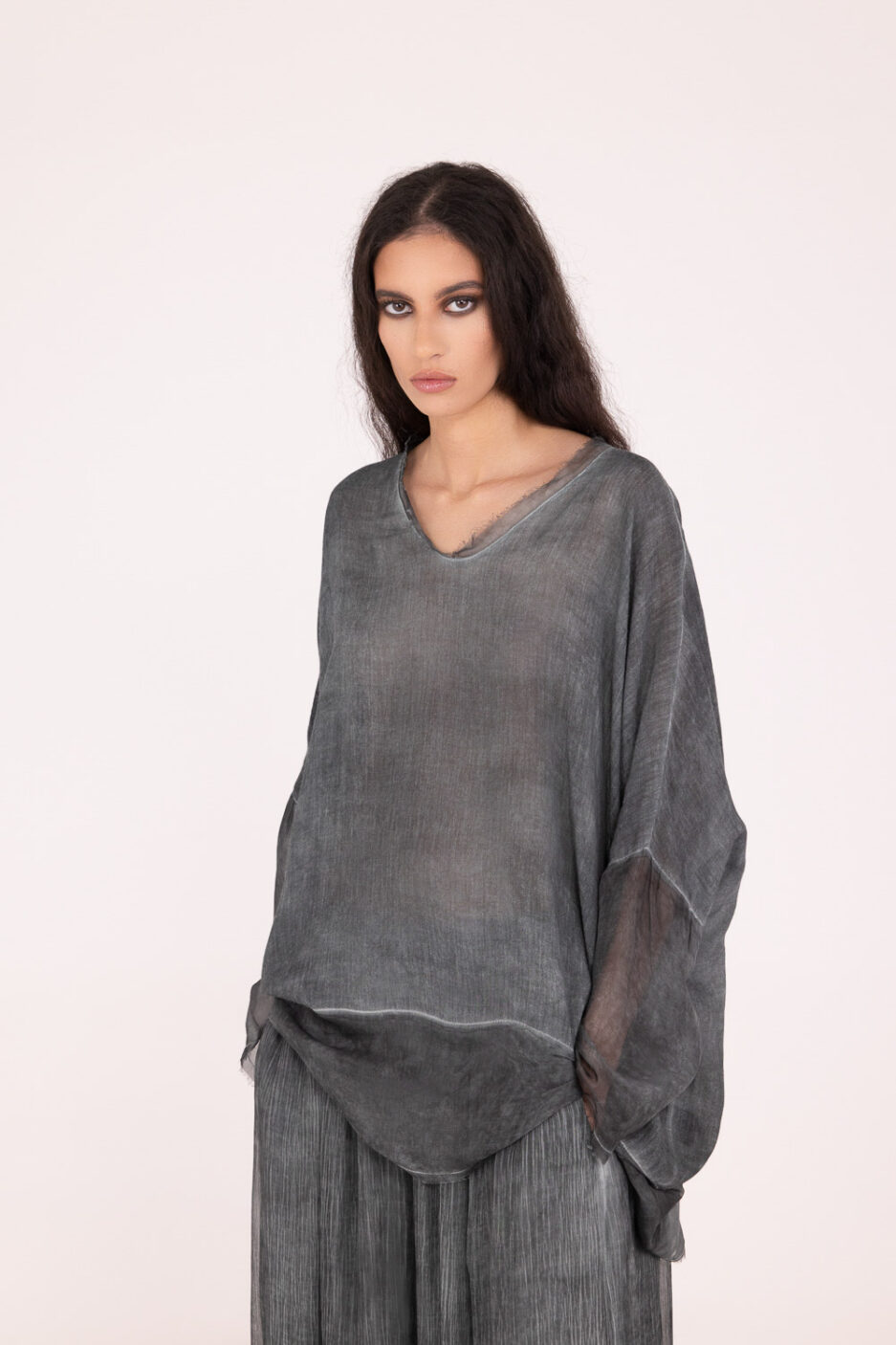 Camiseta de manga larga, cuello redondo, hombro caído en viscosa/lana y viscosa/seda, teñido en frío