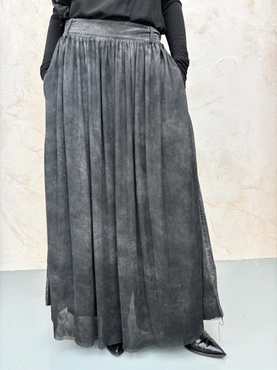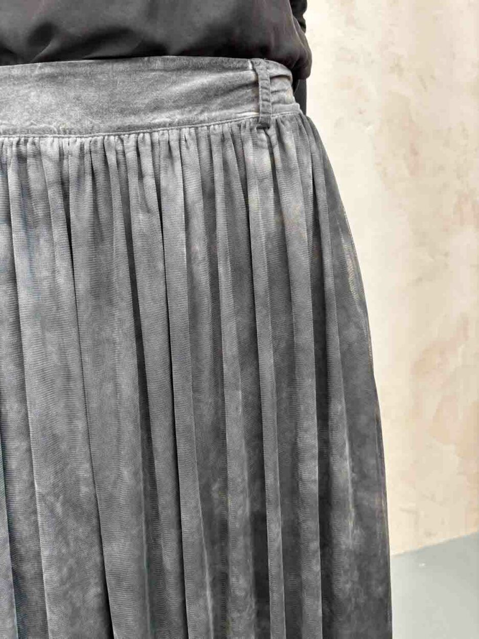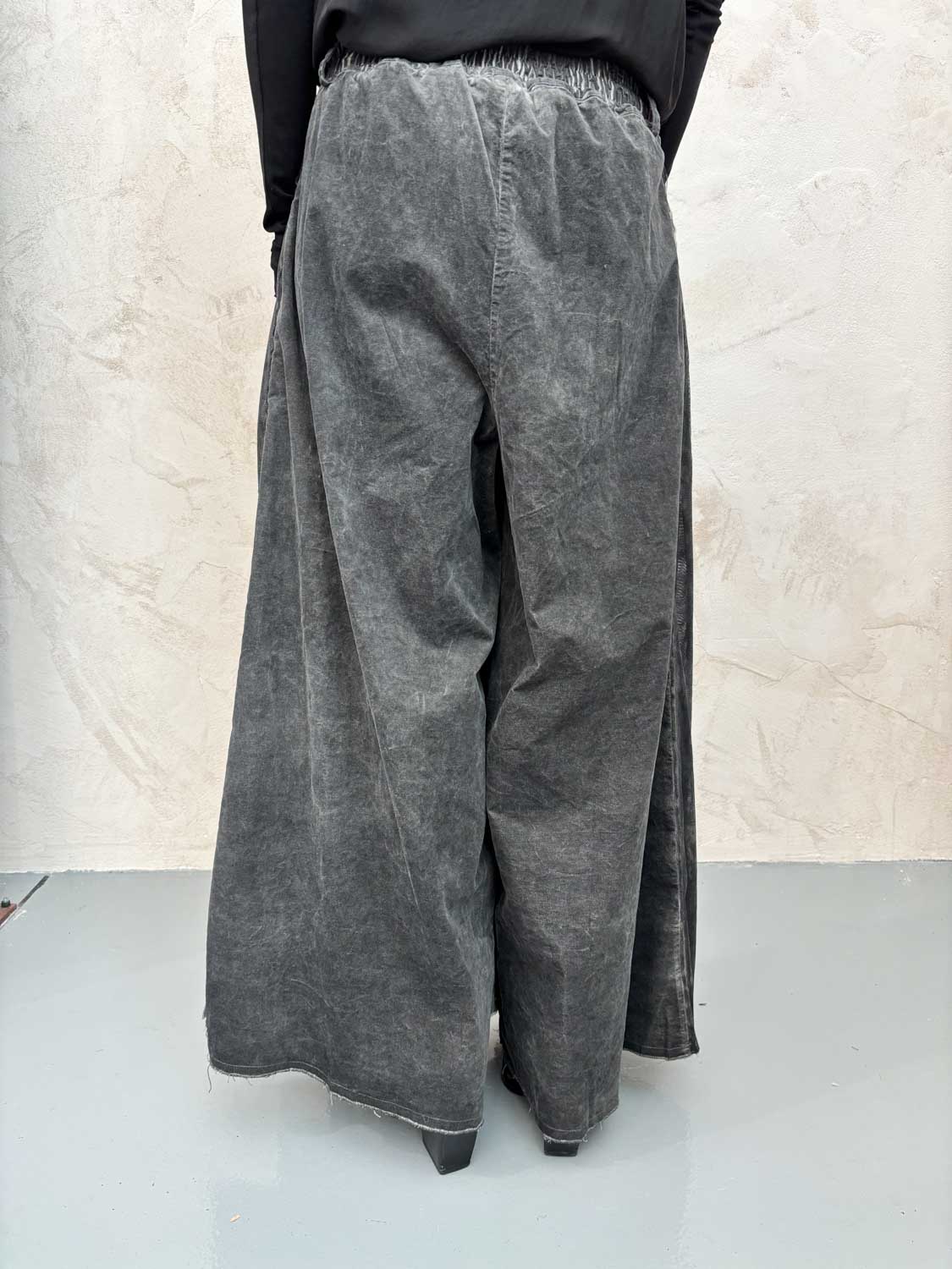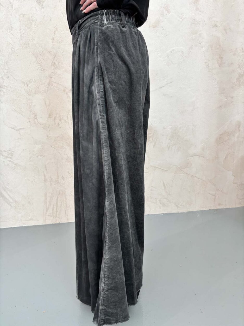 PANTALÓN CON CINTURA ELÁSTICA EN TERCIOPELO DE ALGODÓN ESMERILADO CON INSERCIONES EN LA PARTE DELANTERA EN TUL TEÑIDO FRÍO.