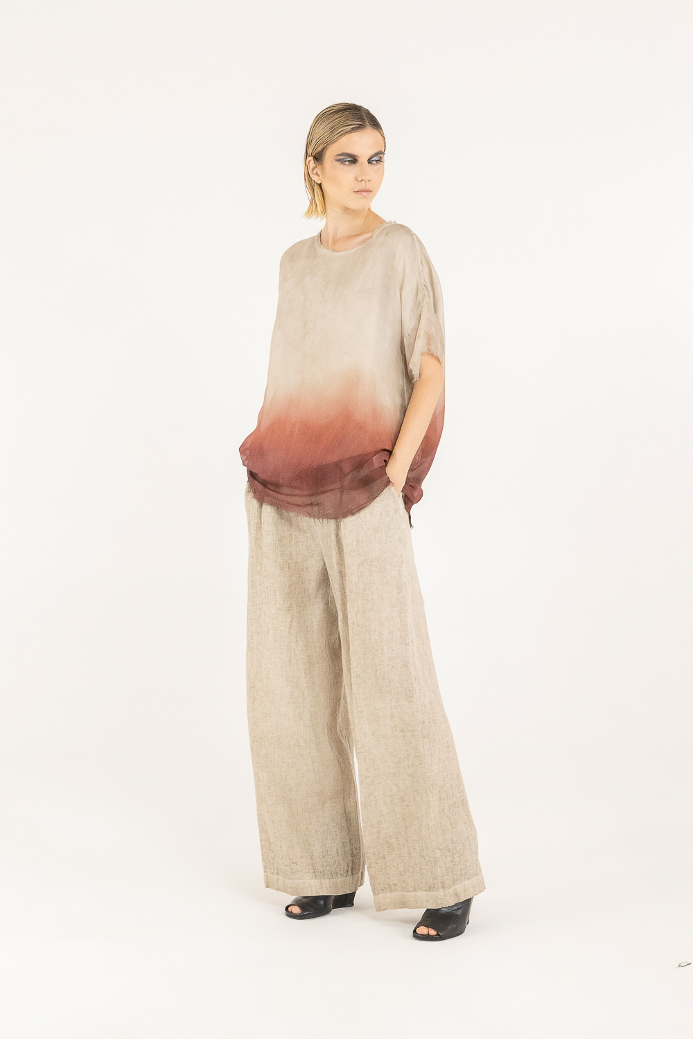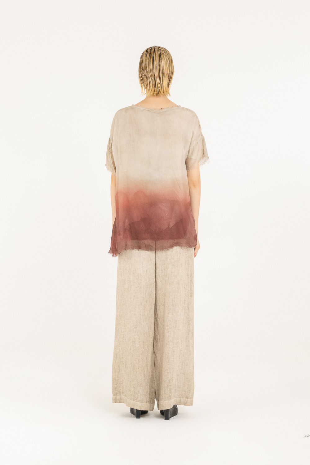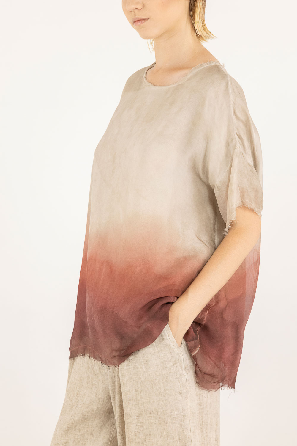 CAMISETA DE MANGA CORTA DE CORTE CUADRADO, TEÑIDA EN FRÍO, EN SEDA VISCOSA DOBLE CON MUSSELINA DE ALGODÓN TEÑIDA A MANO, EFECTO DEGRADADO CON AERÓGRAFO