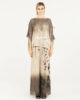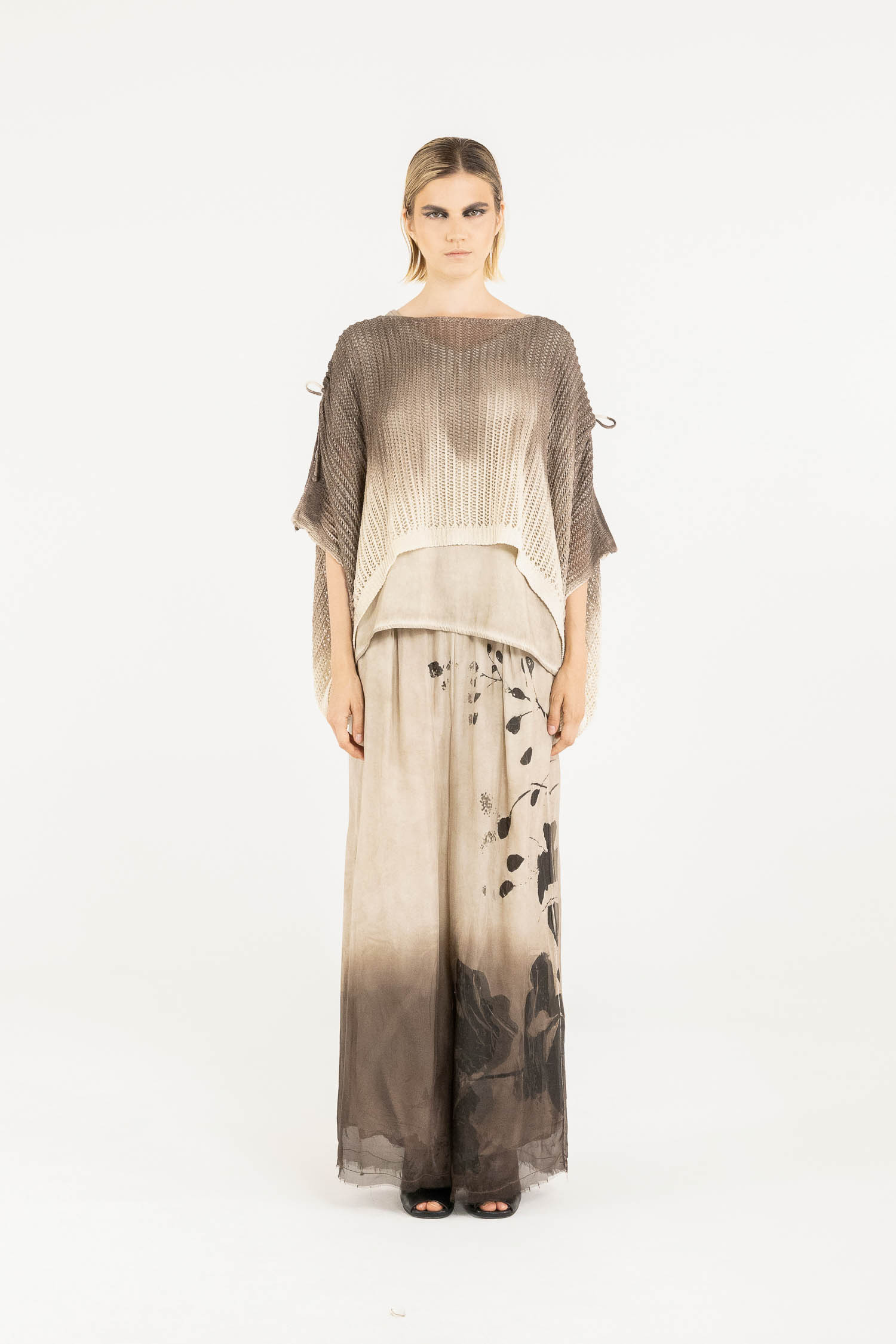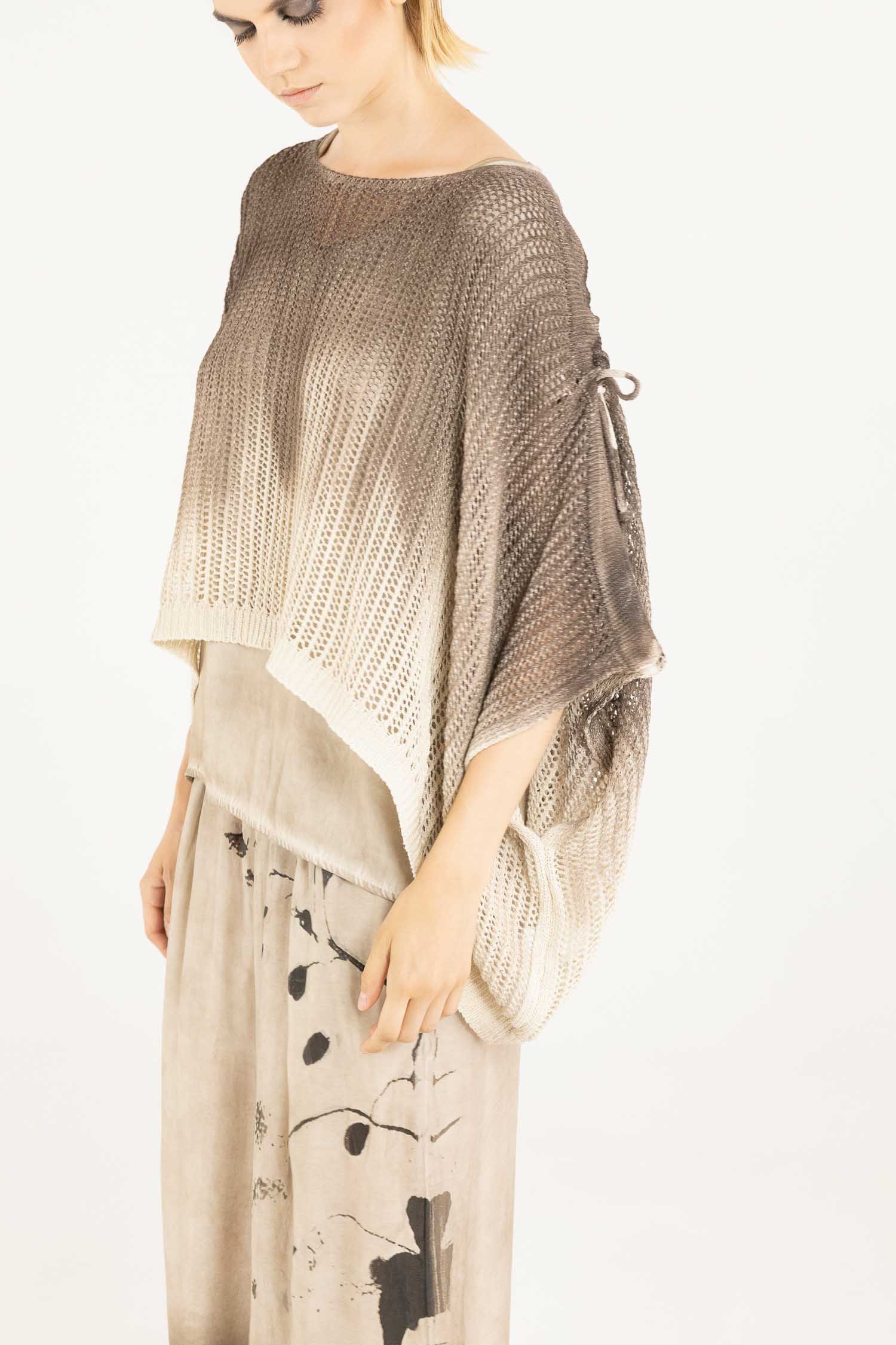 JERSEY ANCHO TEJIDO EN MEZCLA DE ALGODÓN EN MALLA CON MANGAS MURCIÉLAGO, CUELLO REDONDO, ASIMÉTRICO, CON CORDÓN A LO LARGO DE LOS HOMBROS. DEGRADADO MEZCLADO A MANO CON AERÓGRAFO